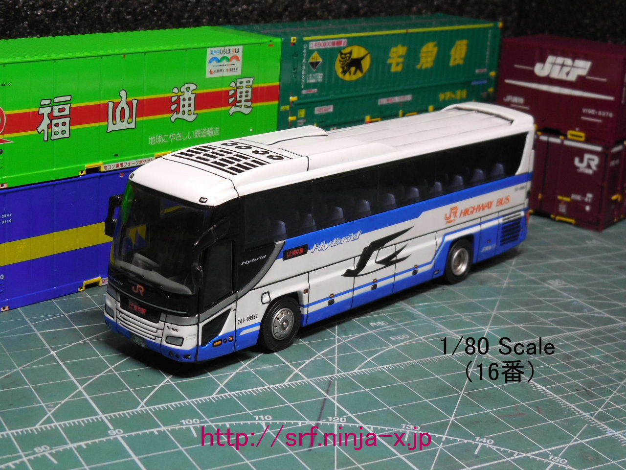 (=トレーンのフェイスフルバス「No.13 ジェイアール東海バス」とガイアノーツの「GP-05 ウルトラマリンブルー」とGSIクレオスのMr.カラー「C8 シルバー」「C35 明灰白色1」「C58 黄橙色」「C59 オレンジ(橙)」「C67 光沢 パープル(紫)」「GX2 ウイノーブラック」「GX3 ハーマンレッド」「GX5 スージーブルー」「GX100 光沢 スーパークリアーⅢ」「GX101 GXクリアブラック」・GM01「ガンダムマーカー スミイレ用(ブラック)/極細」・「B504 Mr.メタルプライマー改 スプレータイプ」・「SF291 Mr.フィニッシングサーフェイサー 1500 ホワイト ビンタイプ」とコピックの「COPICMODELER 0.02(コピックモデラー スミイレ用)」とグッドスマイルレーシングのMSS-17「GSRカラーデカール(マットブラック)」を使用)