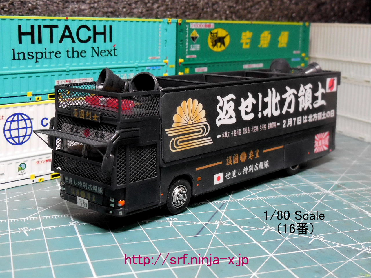 改造箇所は街宣車スローガンを残しつつ、各種ディティールを自作追加(車体前面フロントガラス周りに金網バリケード、天井梁、後輪タイヤハウス装甲カバー、灯具類色差し、スローガンステッカーのクリアーコート等)。