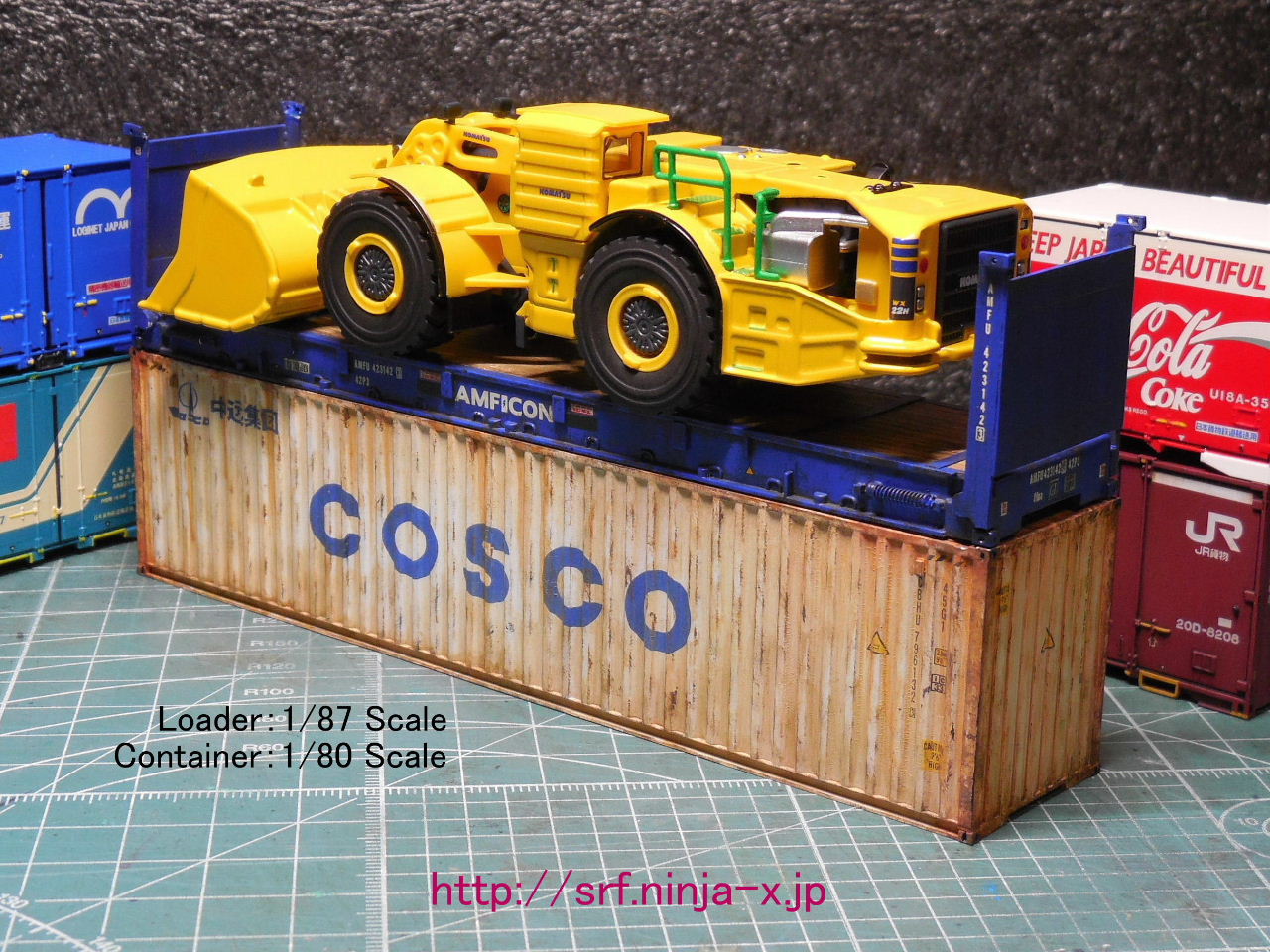 ...早速、輸出シーンを再現!「40ftフラットラックコンテナ」に積載!車幅はコンテナにピッタリ収まった。車両の重心が不明。あくまでも、建機・1/87、コンテナ・1/80のリミックス。ホント、SF映画の装甲車の様でカッコイイ。。