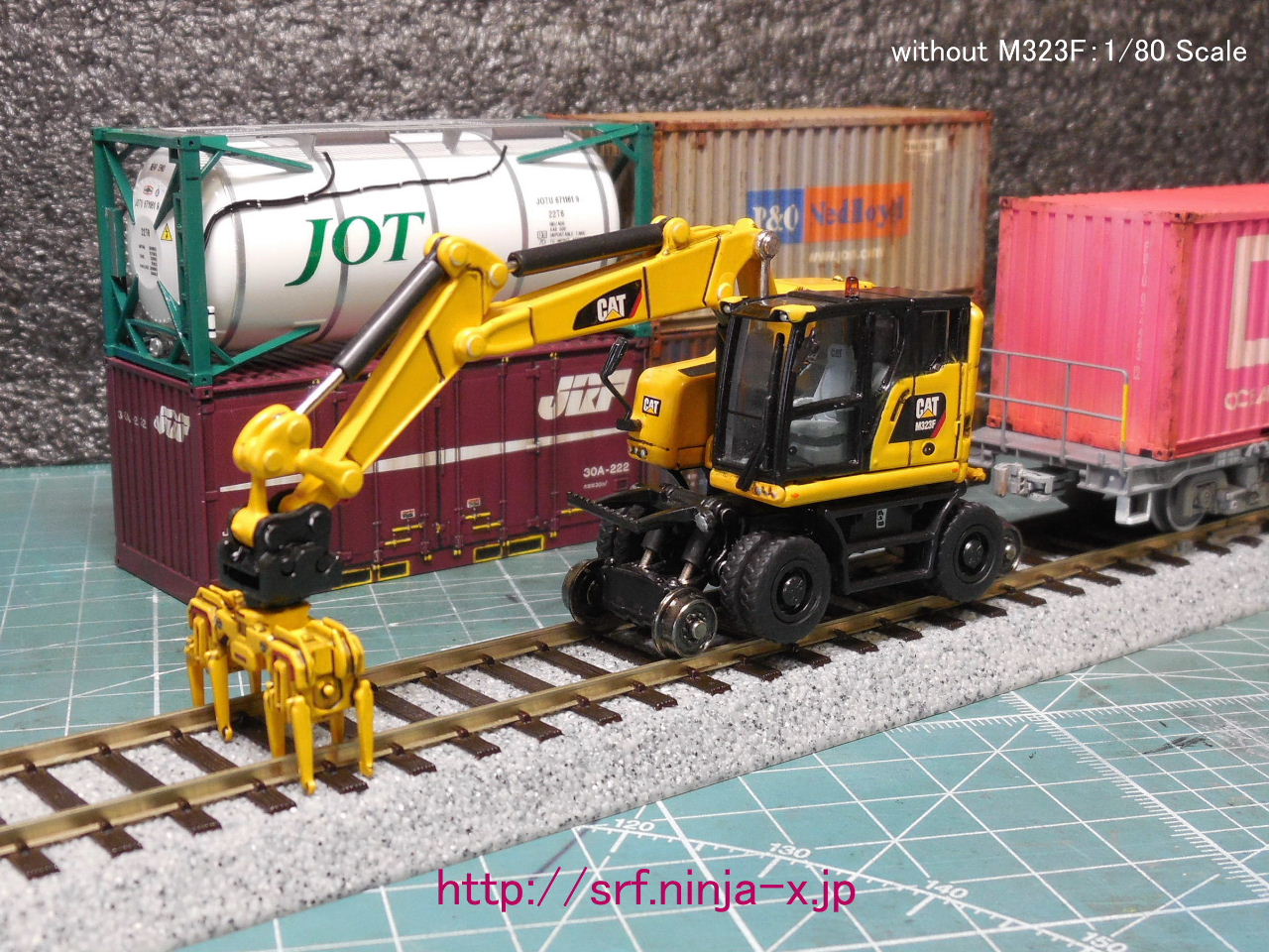ブームやアーム、バケットが可動し、360度旋回可能。通常のバケットの他に2種類のアタッチメントが付属する(レールや枕木を掴むアタッチメントと砂利を突き固めるタイタンパーアタッチメント)。あくまでも、建機・1/87、コンテナ・1/80のリミックス。軌陸車モノ製品はkibri(キブリ)製が豊富だが、何より設計や金型が古い為、微妙。。