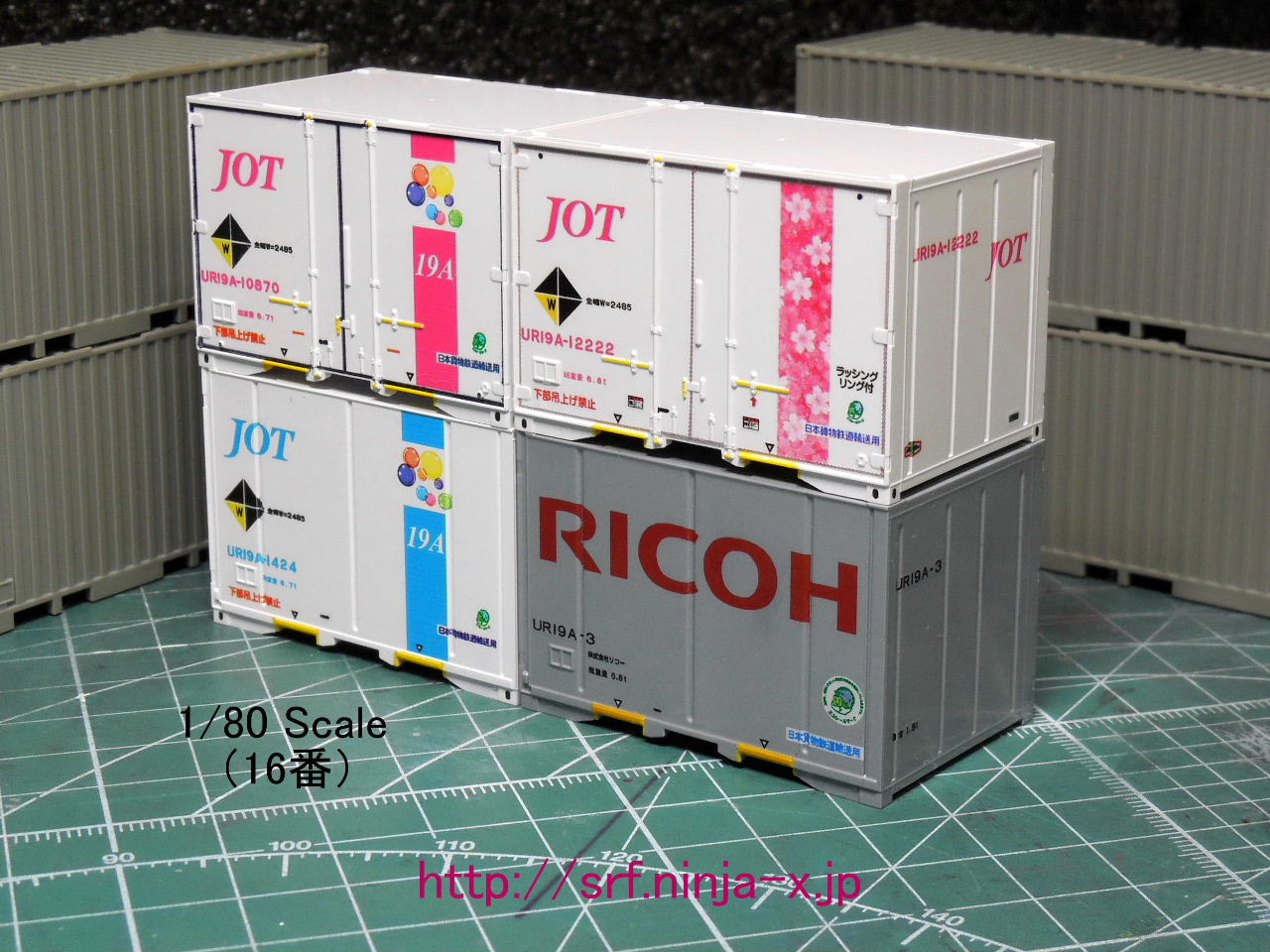 ・上段右:TOMIXのHO-3138「私有 UR19A-12000形コンテナ(日本石油輸送・桜帯)」改の「12ftコンテナ(UR19A-12222)」