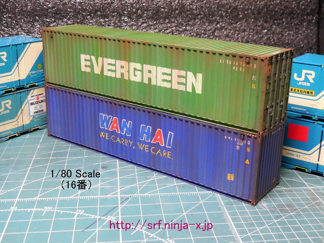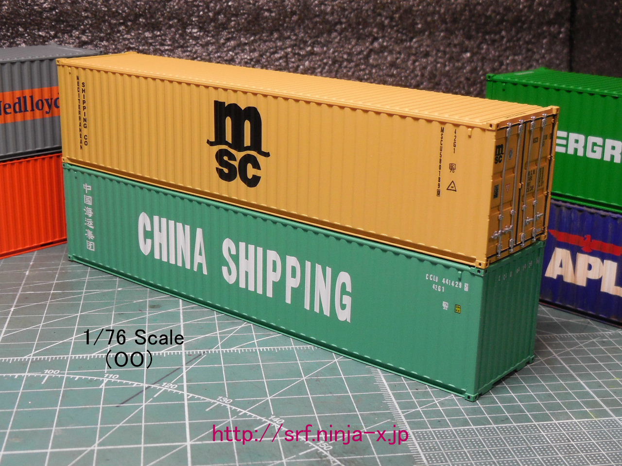 ・下段:モデルアイコンの733Y1「1/80 海上コンテナ 40ft-Hi Cube 無塗装(成形色:ライトグレー)プラキット」改の「40ftコンテナ(45G1)」