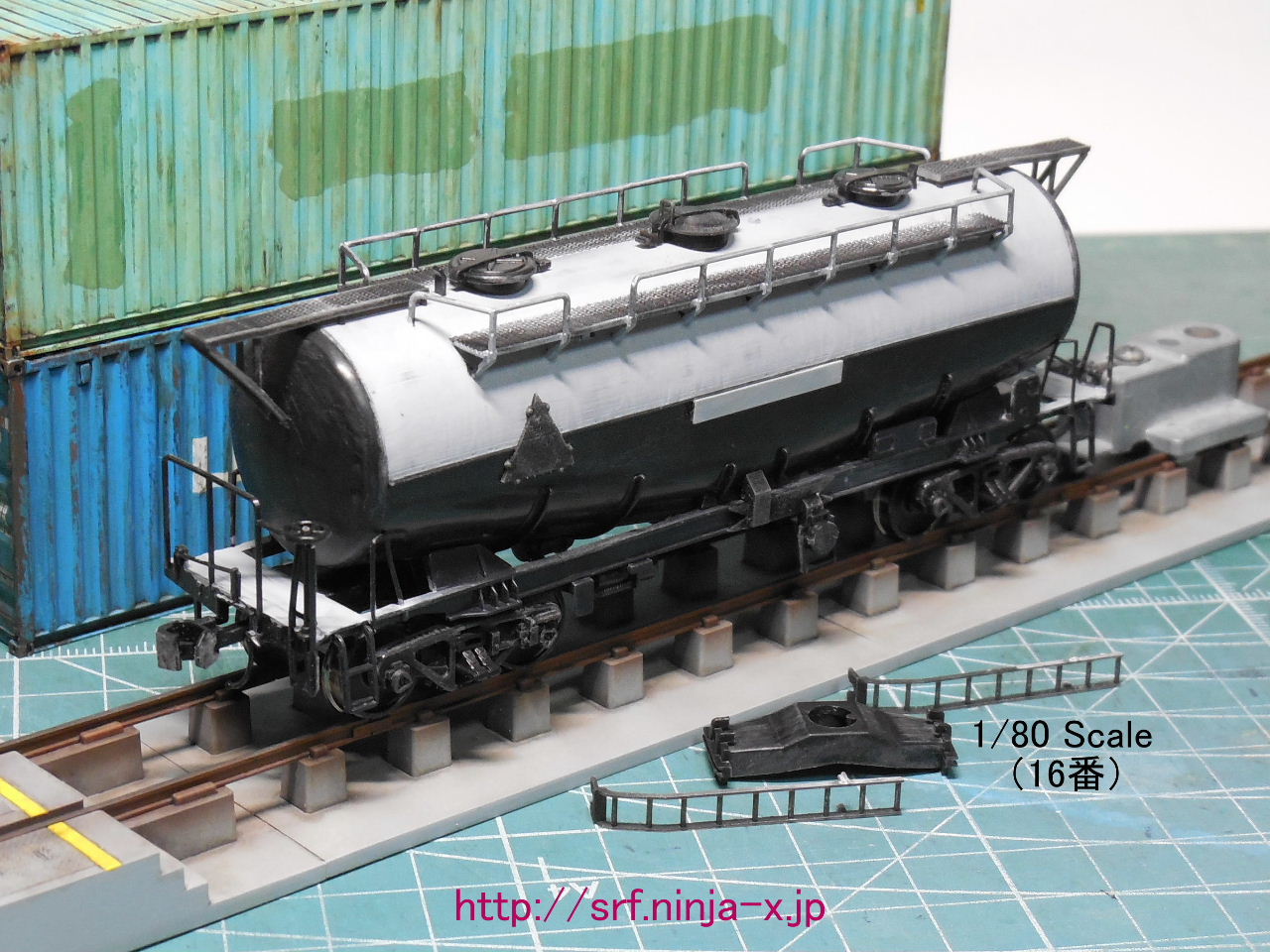 改造はガンプラ工作の様なバラバラの状態でパーツ毎に仮組み~塗装~組み立てという工作フローを強いられる。分解後、タンク体とフレームをそれぞれ白と黒で塗装しデカールを貼付けた。2本のシルバー縦帯はモリタ製タンクコンテナの余り物のデカールを使用。最後にクリア塗装した。1/87スケール(HOゲージ)用デカールの1/80スケール(16番ゲージ)使用は明らかにその小ささが出てしまうが、1/76スケール(OOゲージ)用デカールは違和感なく使う事が出来た。デカールの品質も良好、且つシルクスクリーン印刷デカールで扱いやすかった。
