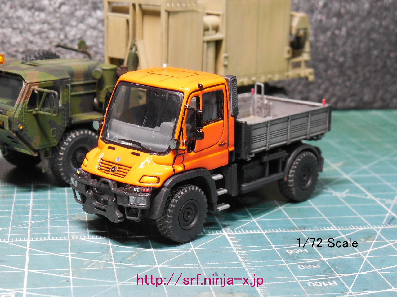 やはりウニモグといえばオレンジ!魔改造風の木製荷台も自作!失敗点としては左右ドア等のスミ入れが難しく、若干太過ぎるオーバースケールとなってしまった(凹スジ深さ不足)。