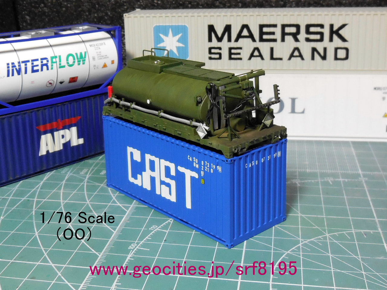 フォークリフト荷役で海コンの二段目に載せられた図。M4 BDMはPLS荷役、フォークリフト荷役、クレーン荷役に対応している模様。自作した赤い消火器が大き過ぎた点、アオシマ「陸自 3 1/2t 燃料タンク車」のパーツを改造使用したタンク体が実物よりも小さい点、ボスニア紛争後のSFOR(NATO平和安定化部隊)マーク(デカール)を片側タンク体に貼ってしまった点が、失敗点。