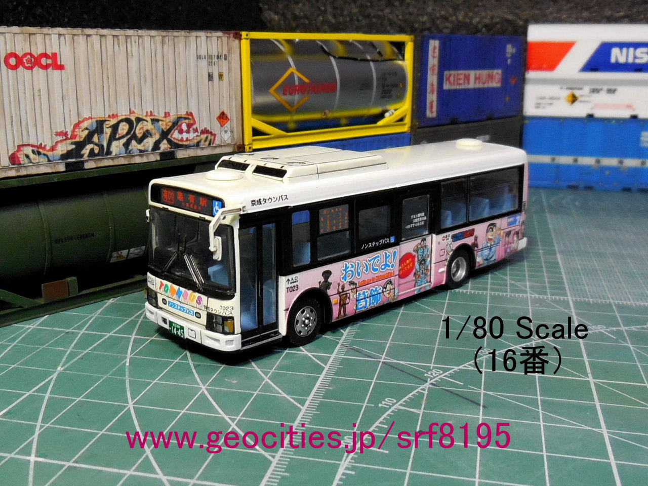 2016年9月17日発売『週刊少年ジャンプ 2016年42号』の『こちら葛飾区亀有公園前派出所』連載完結と相まって発売された、いすゞ・エルガミオ(ERGA Mio)「PA-LR234J1改(中型路線バス)」京成タウンバス・T023の1/80スケール・16番モデル。改造箇所は、エナメル塗料とガンダムマーカーでスミイレを行ったのみ。