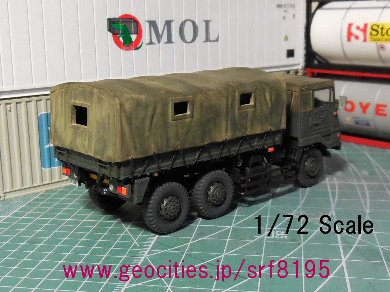 “幌”の塗色はAK-interactiveのピグメントをアクリル溶剤で溶いたもので筆塗り塗装~綿棒でボカシ。塗色は“昭和”な陸自の73式大型トラックをイメージ。。