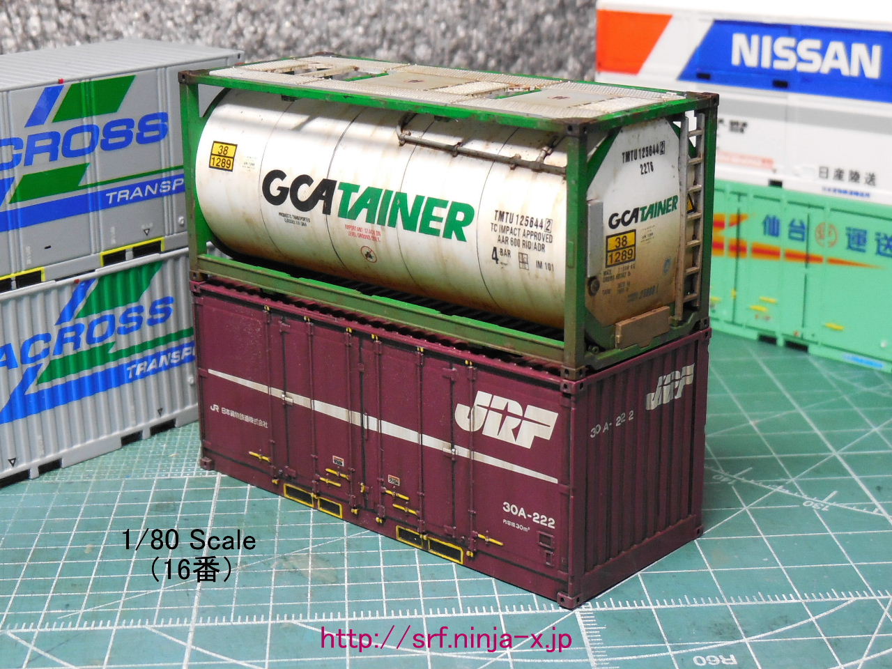 (==C=Rail= Intermodalの「1/76 20ftタンクコンテナデカール」とハセガワのTP4「モデリング ソー スクライバー(模型用けがきノコギリ)」とAK Interactiveの「AK040 LIGHT DUST PIGMENT」「AK044 LIGHT RUST PIGMENT」「AK081 DARK EARTH PIGMENT」とGSIクレオスのMr.カラー「GX1 光沢 クールホワイト」「GX2 ウイノーブラック」「GX6 光沢 モウリーグリーン」「C7 光沢 ブラウン(茶)」「C19 半光沢 サンディブラウン」「C22 半光沢 ダークアース」「C44 半光沢 タン」・Mr.ウェザリングカラー「WCT101 専用うすめ液」「WC01 マルチブラック」「WC02 グランドブラウン」「WC04 サンディウォッシュ」「WC05 マルチホワイト」「WC06 マルチグレー」「WC08 ラストオレンジ」・「B514 Mr.スーパークリアー(溶剤系スプレー)つや消し」を使用)