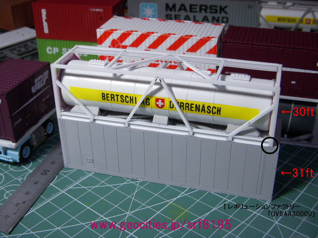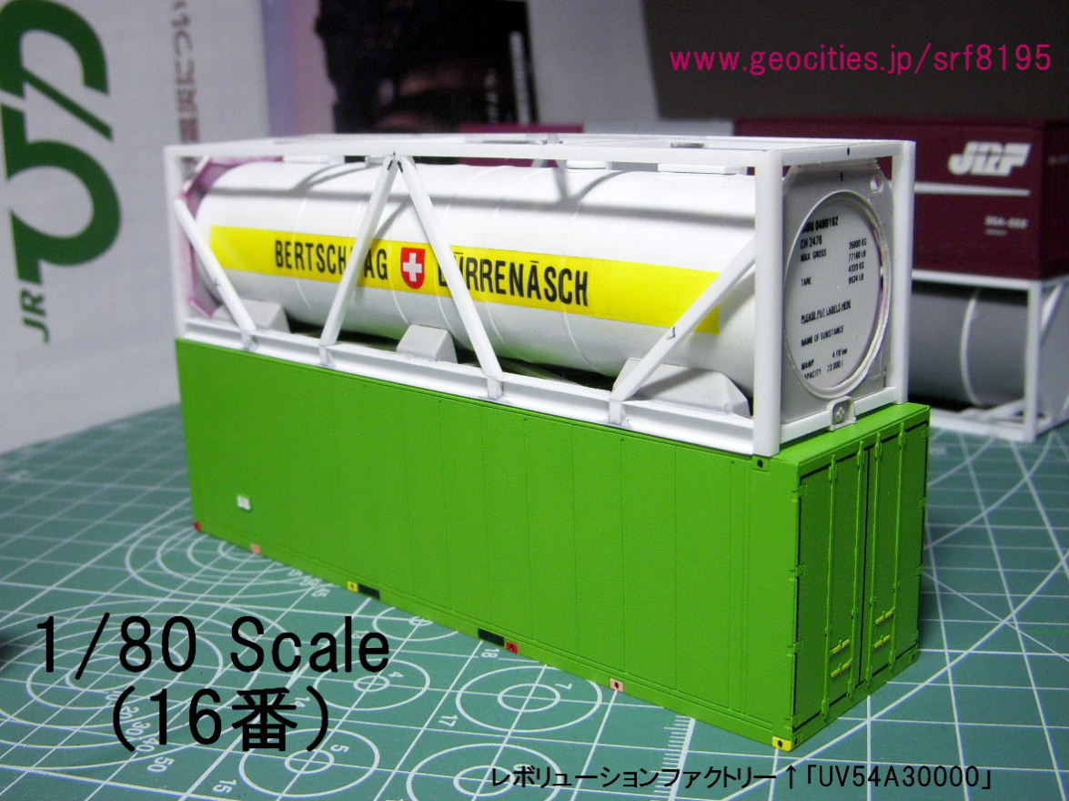 今回の16番・30ftタンクコンテナ製作にあたり、各種寸法取りに欠く事が出来なかった、レボリューションファクトリーのJR-31ftコンテナ「UV54A30000(16番サイズ=1/80スケール)」。