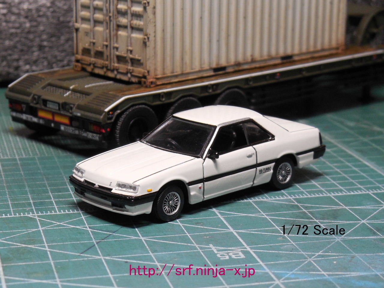 「ニッサン スカイライン HT2000 RSターボ E-DR30」の完成品・ダイキャストモデル。「ヤフオク」で中古品を購入(販売元の株式会社 ヨーデル(Yodel)は廃業した模様)。改造箇所は極細マーカーでスミイレ、色差しを行ったのみ。背景は同スケールのアオシマ・陸上自衛隊 73式特大型セミトレーラ+セミスクラッチ(KILOKITS+Trumpeter)・22G1。