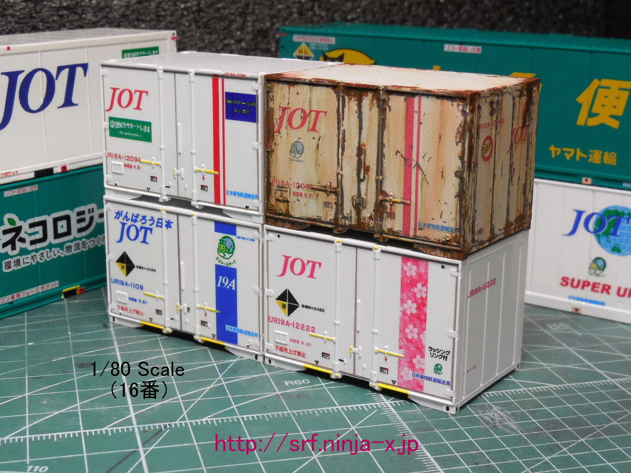 ・上段右:TOMIXのHO-3138「私有 UR19A-12000形コンテナ(日本石油輸送・桜帯)」改の「12ftコンテナ(UR19A-12222)」