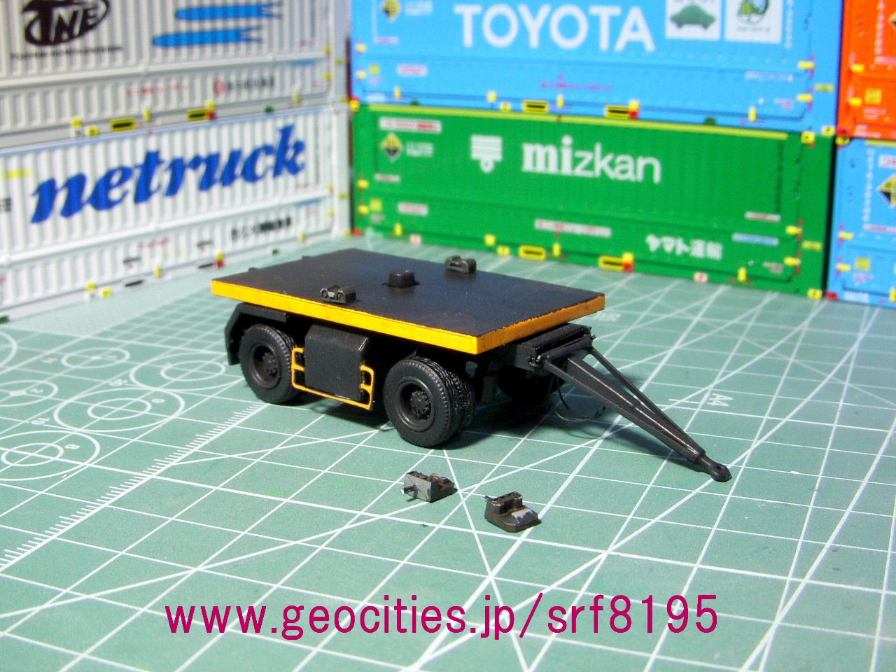 背景は種車のHongwell「商品名不明-PANALPINAのフルトレーラ(1/87スケール=HOスケール)」=300円也!TOMIXの「JR 19D形コンテナ(鉄道コンテナ輸送50年記念カラー)(1/80スケール)」*1台と、エンドウの「19B型コンテナ(1/80スケール)」*1台を積載。