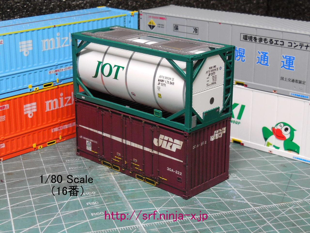タンク体垂直ストライプのメタリックデカールは、タンク体の円弧にうねり無く貼り付ける事に注意を払った(アクリル樹脂製のタンク体には凹凸モールド等の貼付目標物が一切、無い)。海コンの標記類は一部、1/87他の余剰デカールを併用し、補完した。