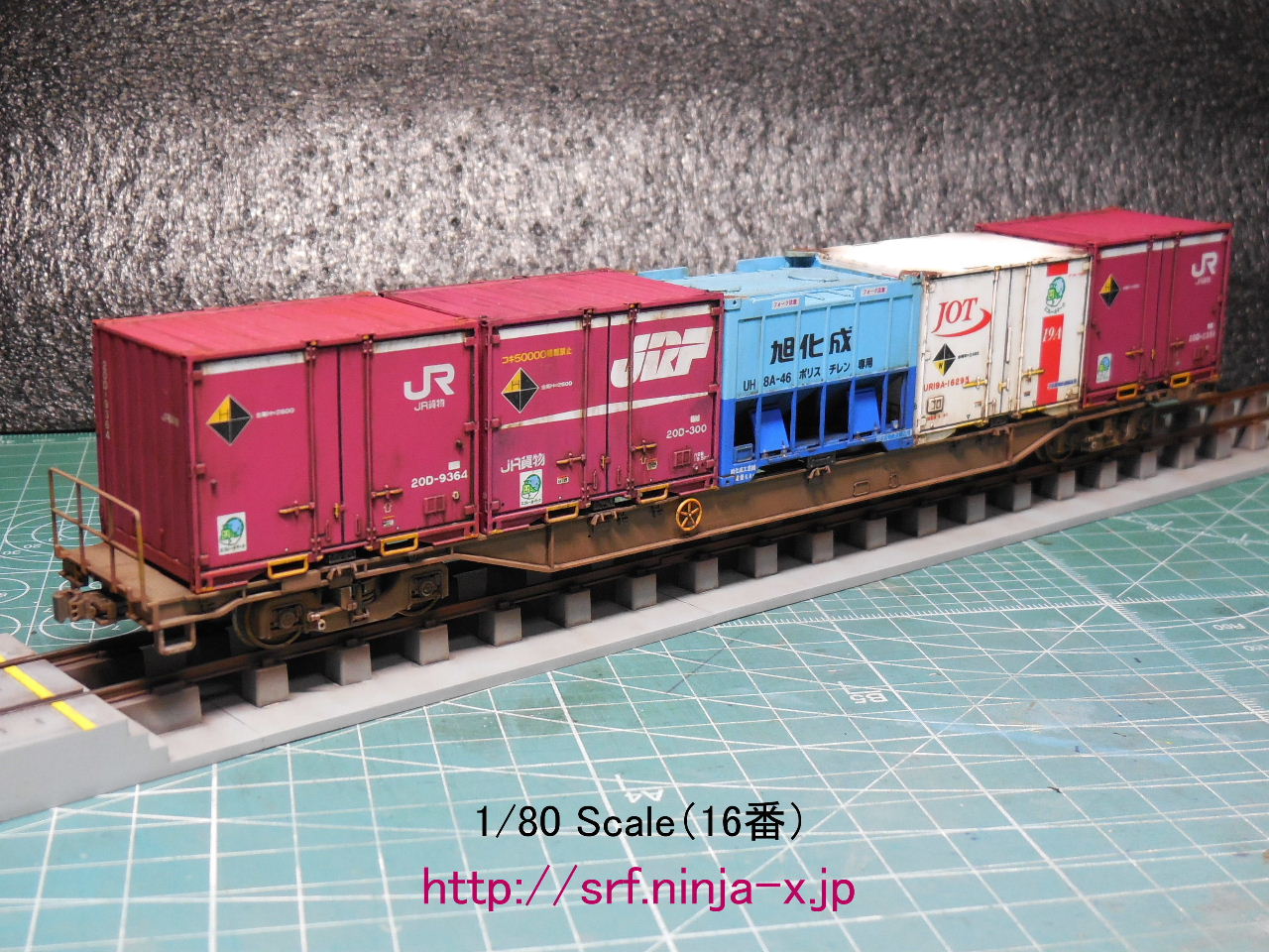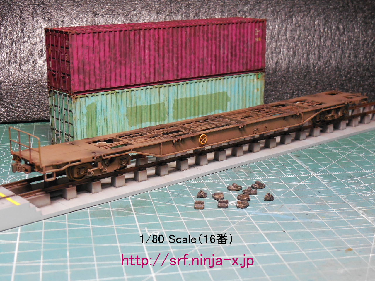 (=TOMIXのHO-718「JR貨車 コキ106形(グレー・コンテナなし)」とIMONの「IMONカプラー HO-102」とガイアノーツの鉄道模型用カラーシリーズ「1012 赤サビ」とGSIクレオスのMr.カラー「GX1 光沢 クールホワイト」「GX2 ウイノーブラック」「GX100 スーパークリアーⅢ」「C7 光沢 ブラウン(茶)」「C19 半光沢 サンディブラウン」「C22 半光沢 ダークアース」「C44 半光沢 タン」「C45 セールカラー」「C97 灰色9号」・Mr.ウェザリングカラー「WCT101 専用うすめ液」「WC01 マルチブラック」「WC02 グランドブラウン」「WC04 サンディウォッシュ」「WC05 マルチホワイト」「WC06 マルチグレー」・「B514 Mr.スーパークリアー(溶剤系スプレー)つや消し」「GM01 ガンダムマーカー スミイレ用(ブラック)/極細」とAK Interactiveの「AK120 OIF & OEF US VEHICLES WEATHERING SET(「AK121 OIF & OEF Wash」「AK123 OIF & OEF Streaking Effects」)」「AK7010 TRAINS UNDERCARRIAGE(「AK7011 Light Rust Wash」「AK7013 Light Dust Deposit」)」「AK7023 ROLLING STOCK WEATHERING SET(「AK7024 Railroad Wash」「AK086 Dark Steel」「AK2042 Dark Rust」)」「AK040 LIGHT DUST PIGMENT」「AK044 LIGHT RUST PIGMENT」「AK081 DARK EARTH PIGMENT」を使用)