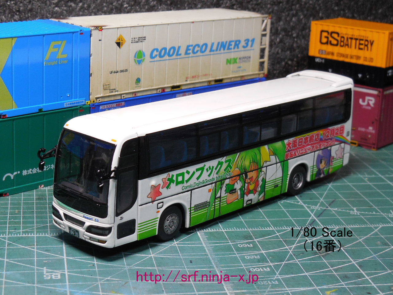 ワンマイルの1/80・バス模型、改造5台目!2006年12月29~31日、東京ビッグサイトで開催された「コミックマーケット71」に合わせて、東京ビッグサイト~秋葉原間で運行された一日限定のシャトルバス、フジエクスプレス・東京営業所所属のリゾート53・T8435(日産ディーゼル工業・スペースウィング KL-RA552RBN/西日本車体工業 MC-02 SD-II)が模型化されたもの(メロンブックス10周年記念“めろバス”具体化プロジェクト)。