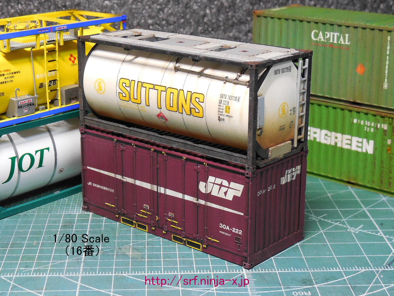 最後にクレオスのウェザリングカラーをかなり薄めたもので雨垂れ跡を描きぼかした。尚、タンク体内部にはネオジム磁石を埋め込み、ヘルパ製(1/87)とオックスフォード製(1/76)のリーチスタッカー、キブリ製(1/87)のトップリフターでの荷役を可能とした。