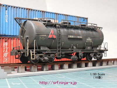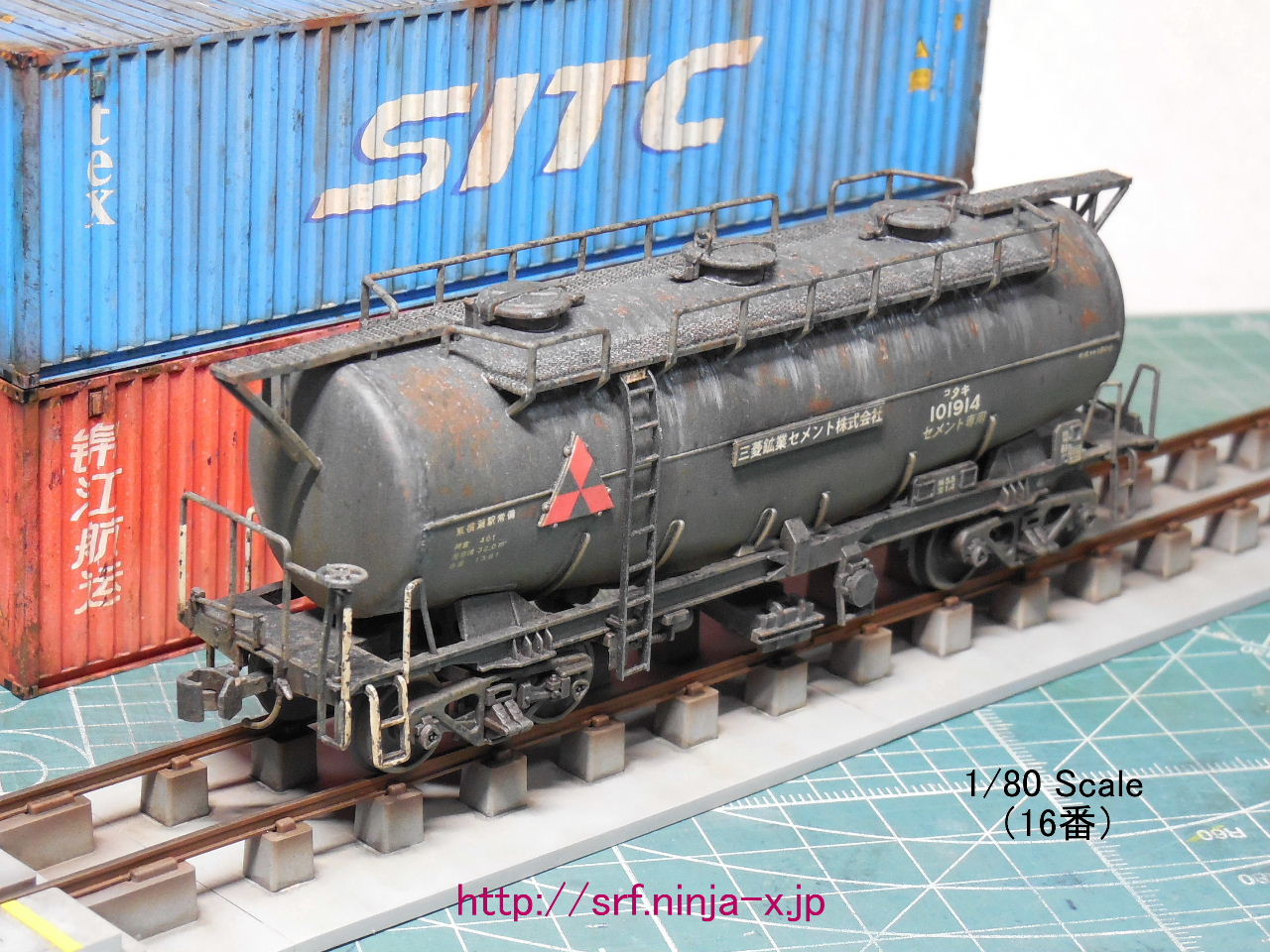 尚、セメントの白い粉の表現にはベビーパウダーを使用。「後位(手ブレーキ装置の有る側)」手摺りの白塗装に黒ハゲチョロがポイント。