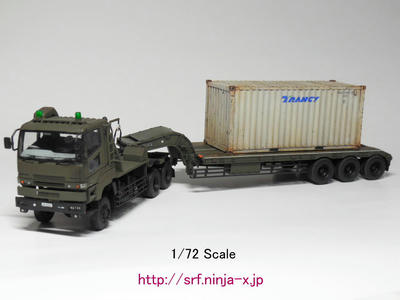 兵站模型!コレをやりたかっただけという(アオシマ「陸上自衛隊 73式特大型セミトレーラ」に20ft海上コンテナ(22G1)積載~チェーン緊締!ネット画像か動画で見た記憶が有るので、既に実現していると思われる)。